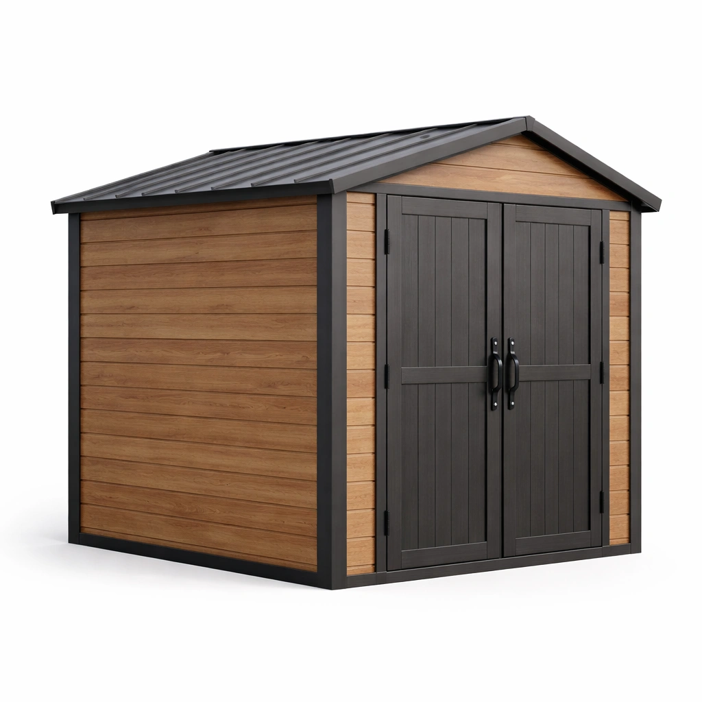 Il capanno da giardino è realizzato con un esterno in resina effetto legno e una struttura interna in acciaio. Il colore principale è Marrone, mentre le rifiniture sono in Nero. Le dimensioni sono 190 cm di lunghezza, 160 cm di larghezza e 185 cm di altezza. Include una porta doppia e il trattamento anticorrosione e anti-UV garantisce una resistenza agli agenti atmosferici. Questo capanno è impermeabile e facile da montare con strumenti richiesti. Include un dispositivo di chiusura. Non ci sono finestre.