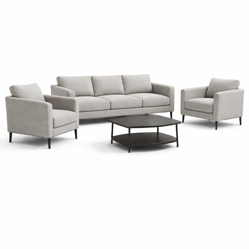 Set composto da un divano a tre posti e due poltrone con rivestimento in tessuto di poliestere beige. La struttura è in legno di pino. L'imbottitura dei cuscini è in schiuma poliuretanica. Il tavolino è in metallo con finitura nera.
